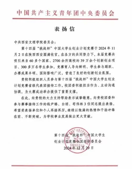近日,我校收到第十四届“挑战杯”中国大学生创业计划竞赛全国组织委员会发来的表扬信,对我校团委及参与赛事接待工作的钱尹璐、白琼、苟伟林三位同志提出表扬。