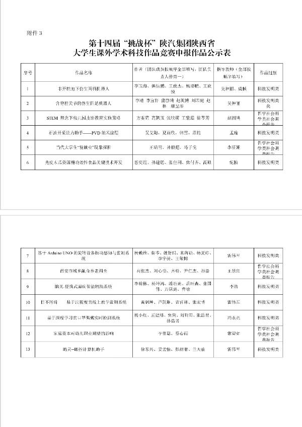 第十四届“挑战杯”陝汽集团陕西省 大学生课外学术科技作品竞赛申报作品公示表