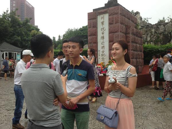 77日,全民族抗战爆发77周年。我校实践队员来到川军抗日阵亡将士纪念碑。该纪念碑是为了纪念在抗日战争中阵亡的60多万川军而于1944年修建的。纪念碑上一位川军士兵,穿着短裤、绑着绑腿,背着斗笠大刀、手握步枪,胸前悬挂两颗手榴弹,注视前方,就像即将冲锋的战士。实践队员们在纪念碑前用鲜花祭奠遇难同胞,感恩阵亡先烈。偶遇成都吉小宝文化艺术中心创建人吉小宝先生的个人纪念抗日英雄画展,他与实践队员亲切交谈,与我们合影留念。此次活动引起成都市广播电台的关注,记者采访了校学生会主席文章同学。